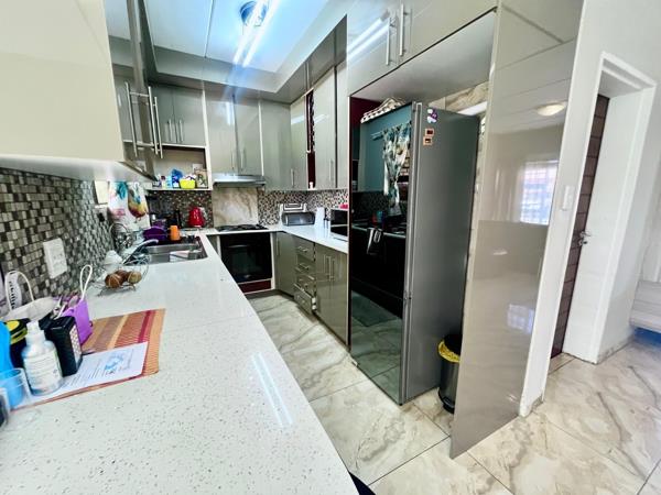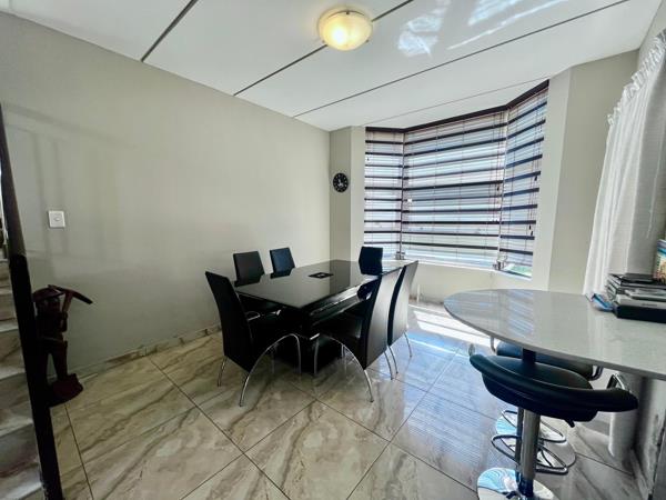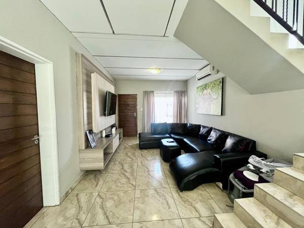 This modern double-storey home is located in a secure, well-maintained complex featuring an access gate, electric fencing, and a staffed security post for complete peace of mind. The ground floor offers an upgraded kitchen with modern cabinetry, a separate scullery, and a pantry, flowing seamlessly into the open-plan dining and lounge areas. The lounge includes a built-in TV stand mounted to the wall, and with an air conditioner on this level, the living space remains comfortable throughout the year. A built-in braai on the patio extends the entertainment area, leading out to a private, pet-friendly garden with neat paving and scenic views. The property also offers additional storage space and convenient back-up water on site.