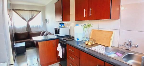The property features two well-sized bedrooms with built-in cupboards, providing ample storage space. The open-plan kitchen flows seamlessly into the living area, creating a warm and inviting space ideal for everyday living and entertaining. The kitchen offers sufficient cupboard space and is designed for practicality and ease of use.