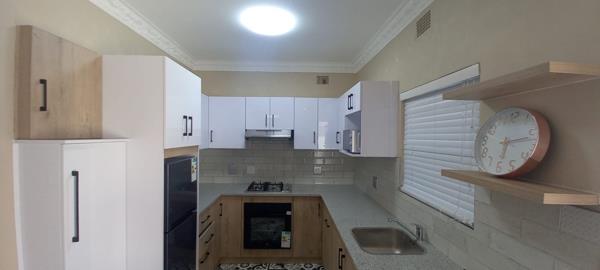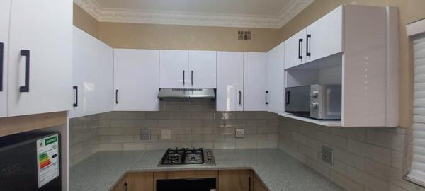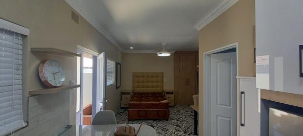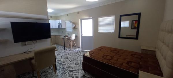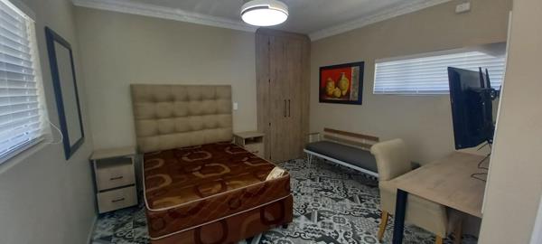 Beautiful kitchen with cupboards, stove, fridge and microwave.Bedroom with build in cupboards, double bed, couch and TV. 1 Bathroom. Own braai area. Communal undercover parking area and laundry area Electric fence and JoJo tank