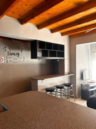 Discover this inviting 2-bedroom, 2-bathroom rental property in Postmasburg, South Africa, offering a functional and distinctive living experience. The open-plan living area features charming exposed wooden beam ceilings, adding character. The well-appointed kitchen boasts dark wood cabinetry, a central island with an integrated hob, built-in oven and microwave, and a double-basin sink with a tiled backsplash. A washing machine is included for added convenience, making this a practical space for daily living.