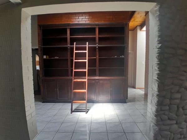 The kitchen consists of enough cupboard space, stove and a scullery / laundry. Unique bookshelf in the passage to the 4 spacious bedrooms all with build in cupboards. The main bedroom has an en-suite bathroom. And for extra convenience there is a guest bathroom and separate toilet.