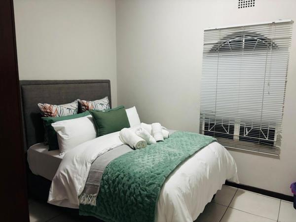 Furnished two bedroom apartment to rent in Royldene. A lovely, safe and secure two bedroomed apartment with an open plan kitchen, dining and living room. Two spacious bedrooms with BIC. Under cover parking. Automated entrance., second gate to property manual. JoJo tank. Water is included in the rental. Pre paid electricity. Call today for a viewing.