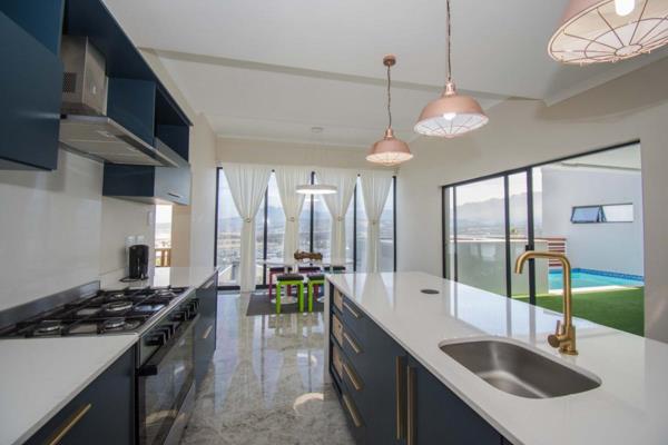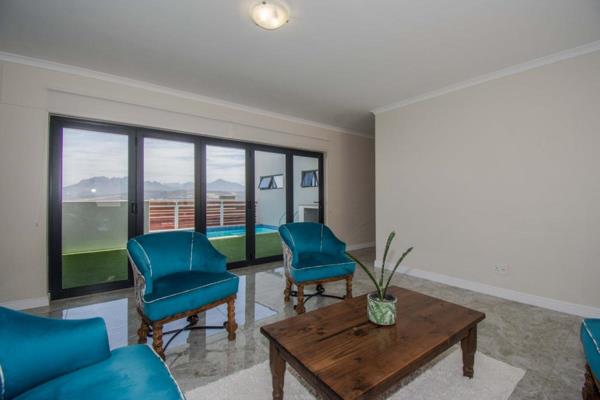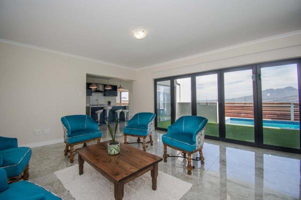 This stunning modern home offers uninterrupted panoramic views of the ocean and surrounding mountains, perfectly combining contemporary design with relaxed coastal living. The home features 3 spacious bedrooms and 2 bathrooms, with the main bedroom upstairs enjoying complete privacy. This luxurious main suite includes a walk-in closet and a stylish en-suite bathroom, while soaking in breathtaking views. Downstairs offers 2 well-sized bedrooms with built-in cupboards, serviced by a full family bathroom. The open-plan lounge and dining area flows effortlessly onto the pool and entertainment area, complete with a built-in braaiideal for entertaining while enjoying the spectacular setting. The modern kitchen is fitted with a gas hob, ample cupboard space, and a large separate scullery with space for multiple appliances, keeping the main living area neat and functional. There is a completely separate flat downstairs which is already tenanted with its own parking and entrance. Additional features include a swimming pool overlooking the ocean and mountains and a double automated garage with direct access. This exceptional home is ideal for families, entertainers, or investors looking for a property with views, space, and income potential.