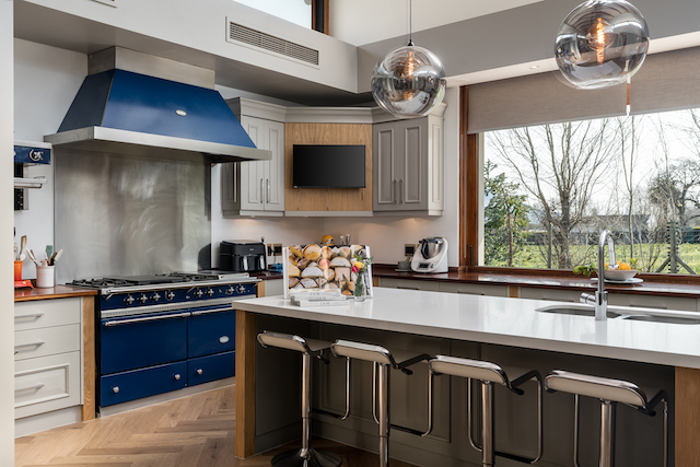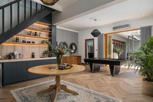 The entertainment flow continues into the games room, fitted with a pool table and coffee station that opens directly onto the courtyard. The spacious kitchen is a chefs dream, boasting a centre island, comfortable seating area, and premium appliances including a Le Canche cooker with gas and electric ovens, gas hob with plancha, extractor fan, and salamander grill. A corridor lined with pantry cupboards leads to the separate scullery, laundry room, and double garage access.
