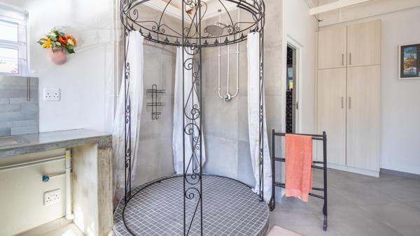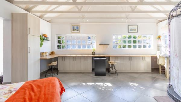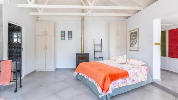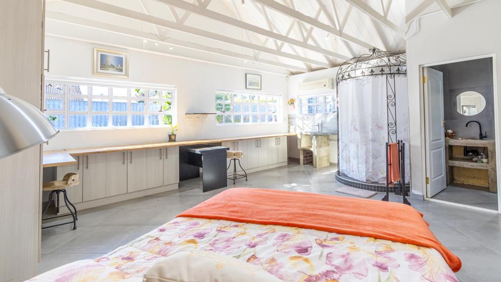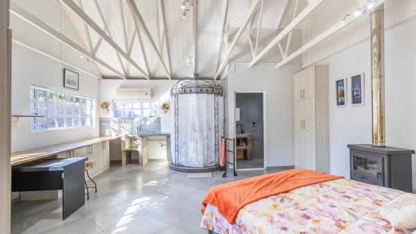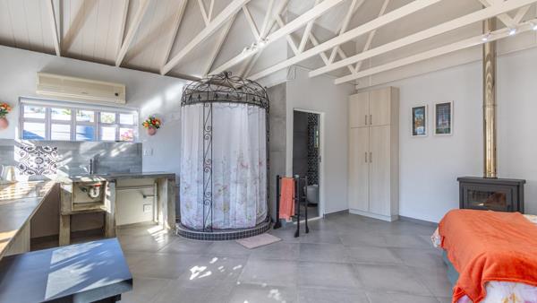 Kitchen area large bedroom with build-in-cupboards, fire place and one of a kind shower.