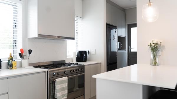 This modern home offers light-filled open-plan living, where the stylish kitchen flows seamlessly into the lounge