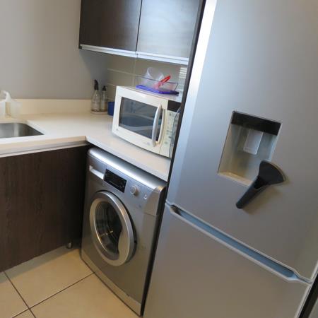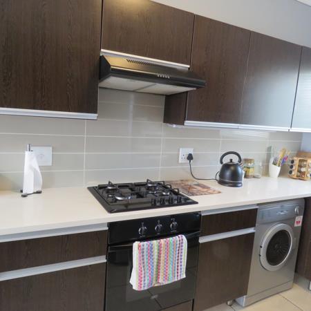 Kitchen Amenities: Equipped with essential appliances including a washing machine, tumble dryer, fridge, gas stove, electric oven.