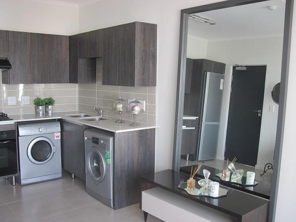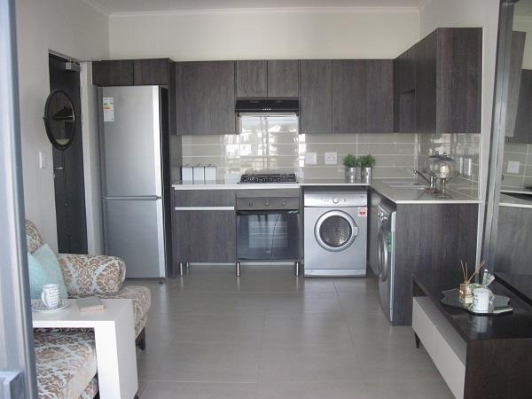 The kitchen is fitted with white Caesar Stone countertops, stainless steel washerdryer, fridge, gas hob with cooker hood, and electric oven.