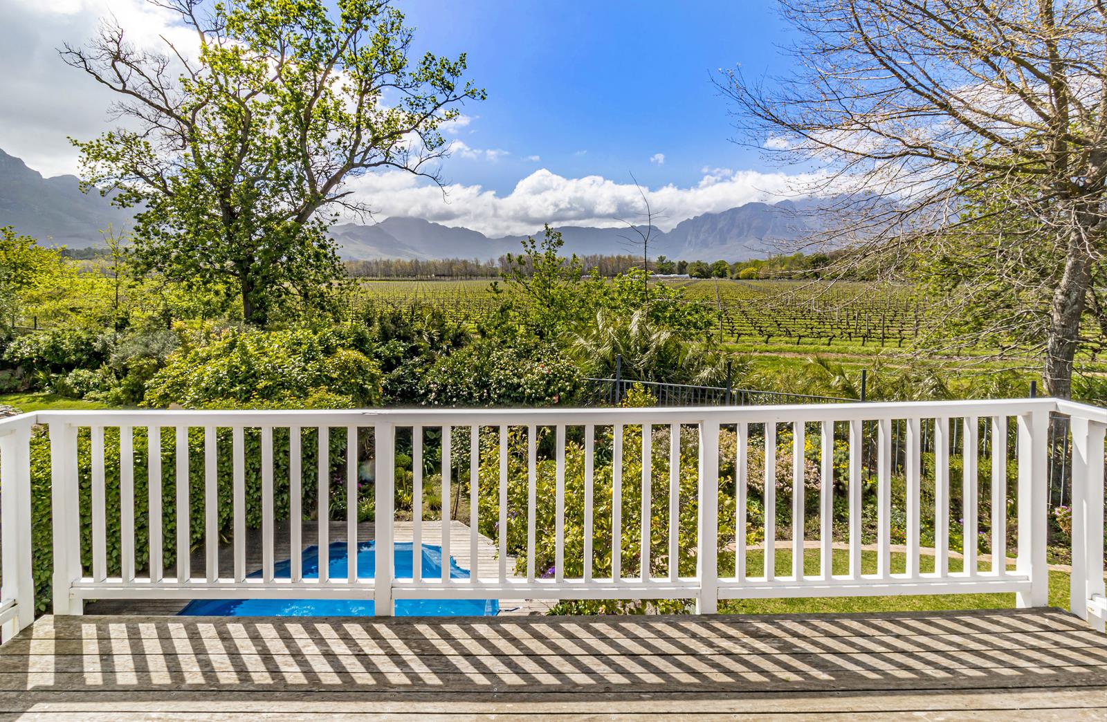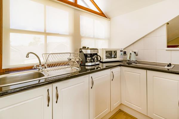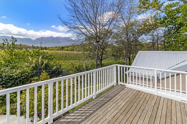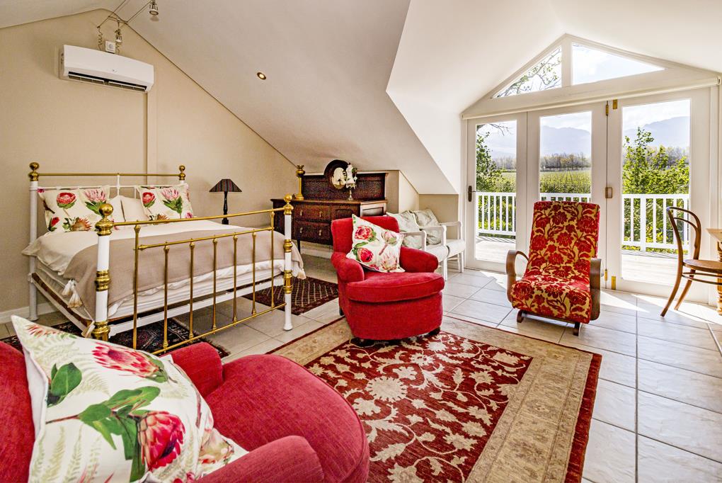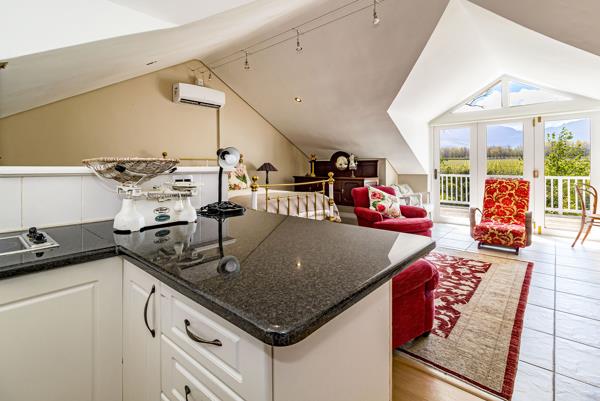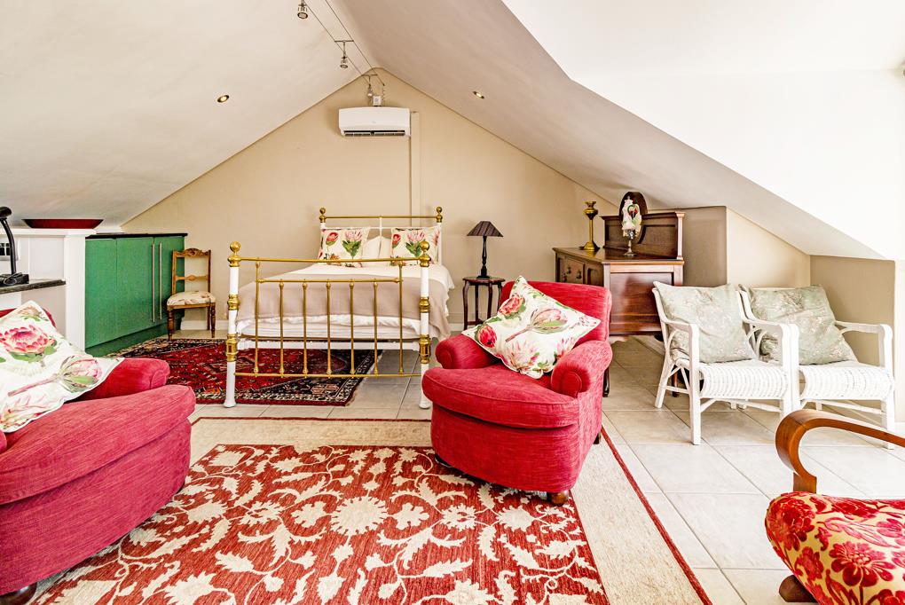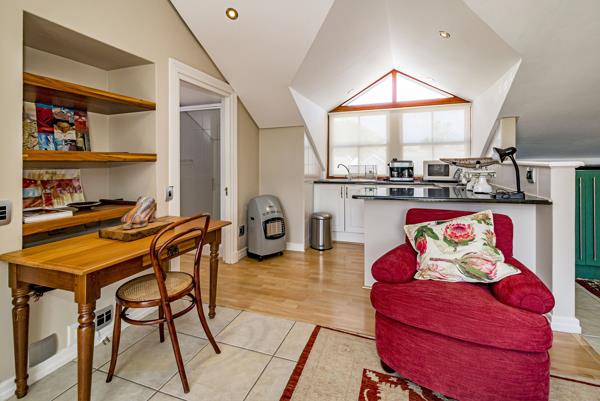 A lovely open plan bachelor upstairs apartment, with private access at the side of the house. It is light and airy with beautiful views of the Helderberg and Lourensford Vineyard. This apartment is perfectly suited for a golfer or single person.