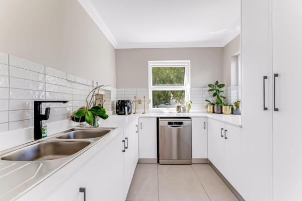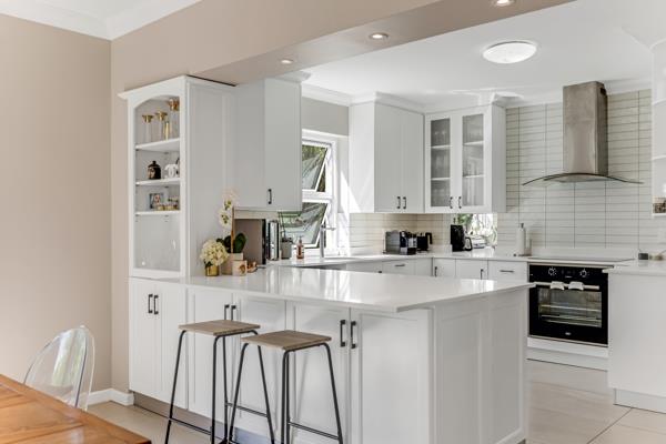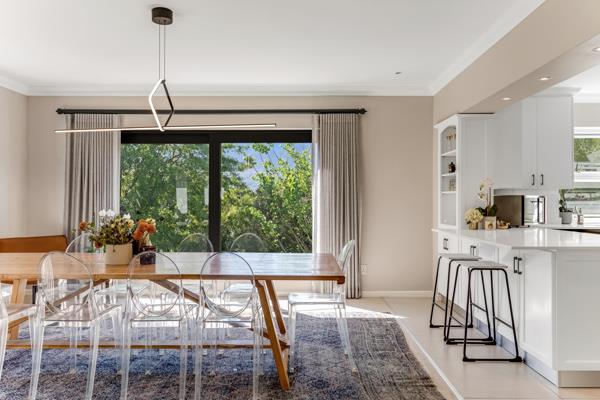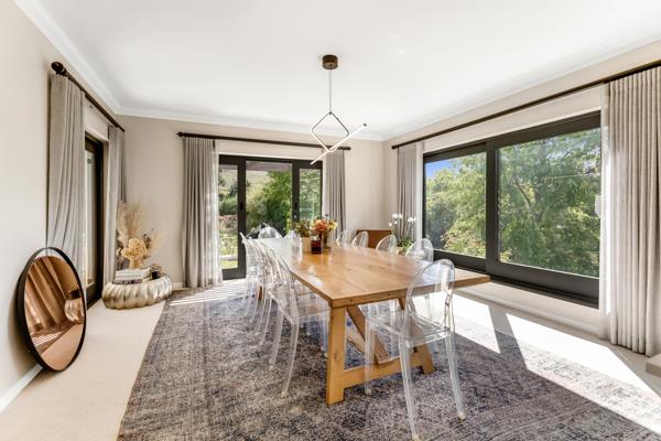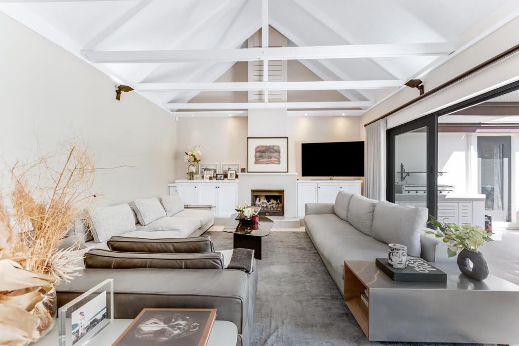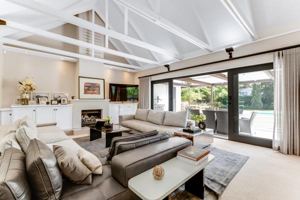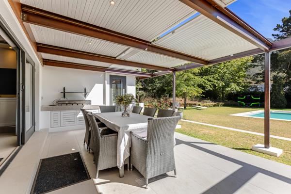 The fully equipped kitchen and open plan dining room is perfect for entertaining. The beautiful light and airy lounge with its exposed beams leads out onto a covered patio with built in braai which is the ideal spot to enjoy sundowners. There are five spacious bedrooms and 4 bathrooms.