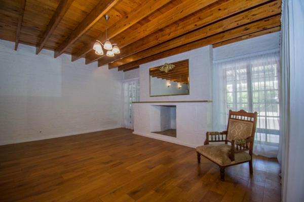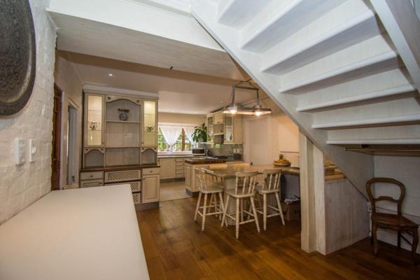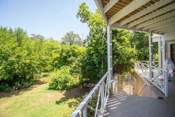This warm and character-filled home offers a rustic farm-style feel with wooden floors and a tranquil, leafy garden. The home features 4 bedrooms and 3 bathrooms, including a versatile downstairs bedroom with its own living area, patio access, and full bathroom - ideal for guests or extended family. Upstairs are three bedrooms with built-in cupboards, two full bathrooms, a private study, a multi-purpose room, and a spacious laundry area. A wrap-around balcony overlooks the serene garden. The downstairs living area provides an easy open-plan flow between the kitchen, dining room, and lounge, complete with two fireplaces for added comfort. The kitchen includes a gas hob, electric oven, extractor fan, dishwasher connection, and access to a scullerypantry. A standout feature is the separate bachelor flat with its own entrance, kitchenette, built-in cupboards, and en-suite bathroom perfect for an au pair or home office. Parking includes a double carport plus space for two extra vehicles. The large, shaded garden offers a peaceful outdoor escape with plenty of space for relaxation.