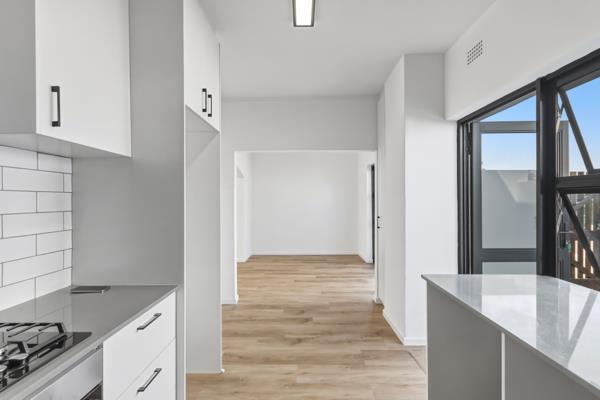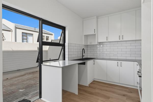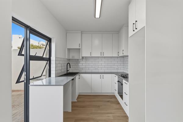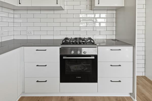 Step inside to discover an inviting open-plan layout that connects the living, dining, and kitchen areas, with light laminate flooring that enhances the bright and airy atmosphere. The heart of this home is its modern kitchen, a culinary haven equipped with sleek white shaker-style cabinetry, contemporary black hardware, and a crisp white subway tile backsplash. It features new, high-quality appliances, including a built-in Bosch oven and a gas hob, catering to both everyday cooking and gourmet endeavors. An integrated peninsula serves as a convenient breakfast bar, perfect for casual meals or as an additional prep surface. Large glass doors in the kitchen and living areas provide direct access to the private outdoor spaces, blurring the lines between indoor comfort and outdoor tranquility.