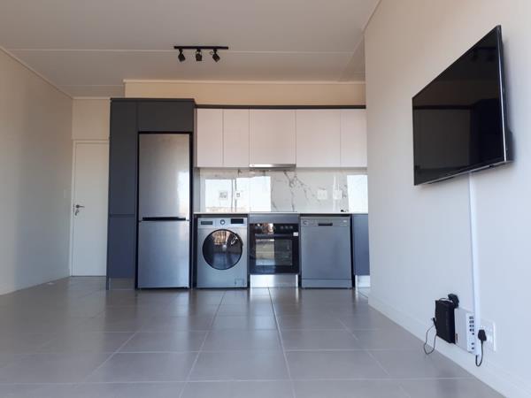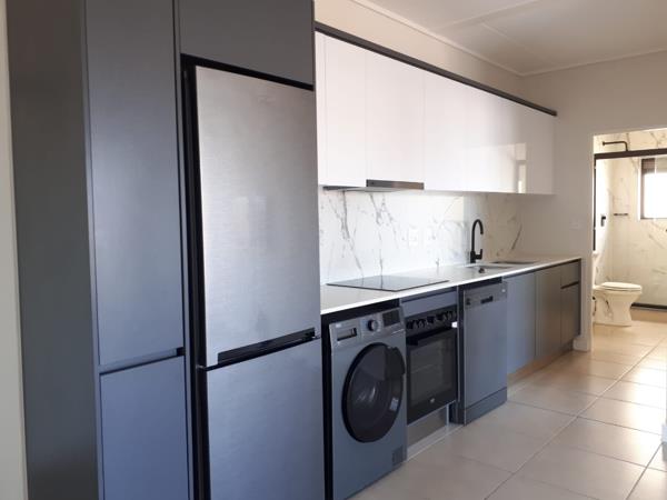 This apartment boasts an open-plan design that imparts a spacious and modern ambiance by seamlessly integrating the living and kitchen areas. The lounge features elegant block-out curtains and comes equipped with a television. The kitchen is fitted with appliances, including a stove, hob, oven, fridge, dishwasher, and a convenient washer/dryer combo.