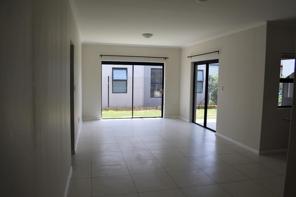 The patio is covered with build in braai. The open plan living area has sliding doors to the fully enclosed garden.