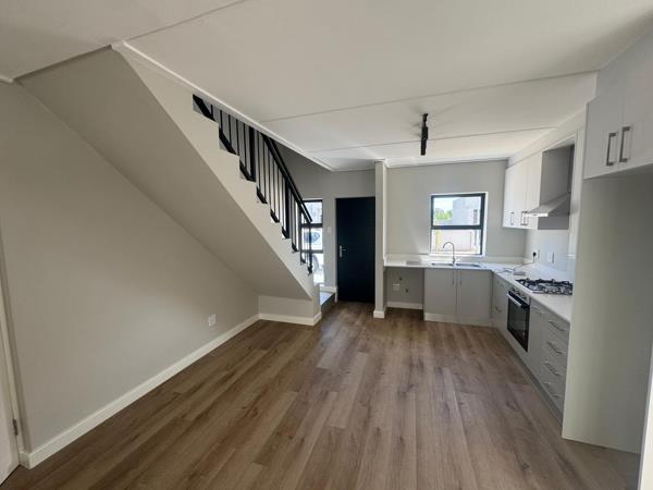 Discover modern living in this inviting 3-bedroom, 2-bathroom rental home located within the desirable Aan de Wijnlanden estate in Stellenbosch. This contemporary residence boasts a sleek design with light grey walls and elegant wood-look laminate flooring throughout. The open-plan layout seamlessly connects living spaces, featuring a modern kitchen equipped with two-tone cabinetry, a new built-in gas hob, oven, and extractor fan, complemented by a double sink.