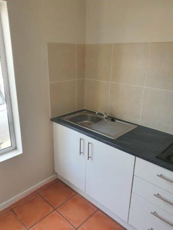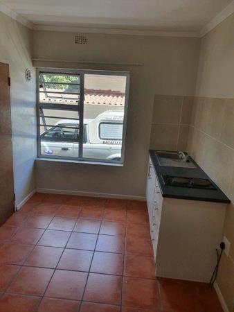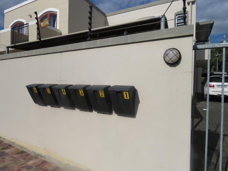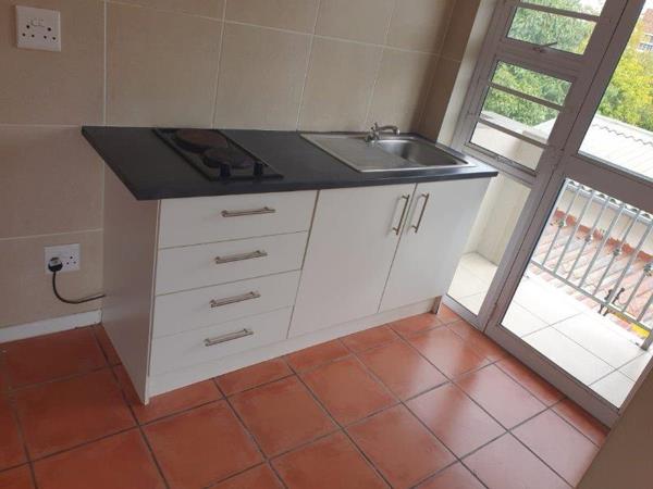This large spacious one bed bachelor apartment is on the 1st floor in a safe complex in central Stellenbosch near the Campus. Few stairs take you up into the open plan kitchen dining area or study area and big bedroom that leads out onto a small balcony with safety gate separating it from the bedroom.