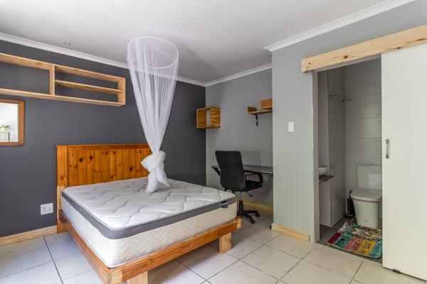 Both bedrooms feature built-in cupboards and each has its own en-suite bathroom, ensuring comfort and privacy. The apartment opens onto a private patio with a built-in braai perfect for morning coffee, study breaks, or relaxed entertaining.