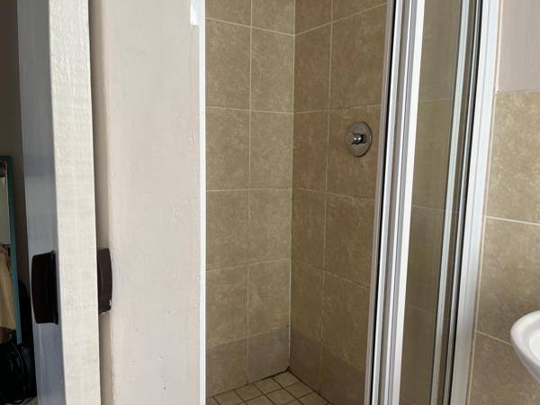 A water point is provided for a washing machine. Furniture and appliances included: fridge, single bed, desk and chair, and couch.