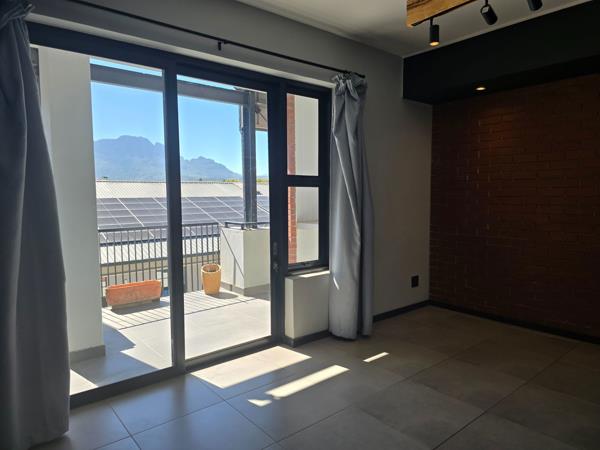 Bosmans Club, Distillery Rd - the ideal duplex apartment for a couple or someone working from home. This duplex apartment is one of 46 units, gets morning sun, is friendly and light. There is a balcony upstairs from the main bedroom and a second balcony downstairs from the living area, from where you can enjoy the beautiful view onto the mountains and river. Upstairs the main bedroom has a dressing room leading to the full bathroom. Electricity is pre-paid, and fibre has been installed. The rent includes two secured basement parking bays. Bosmans Club has a lift, rooftop braai terrace and bicycle shed with a washing bay. The apartment block has a building manager on site during office hours and security guard on site thereafter. Downstairs are a laundrette where Bosmans Club residents washing can be done at a discounted price. Cats are allowed with the approval of the trustees.