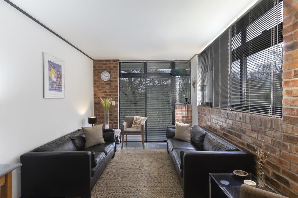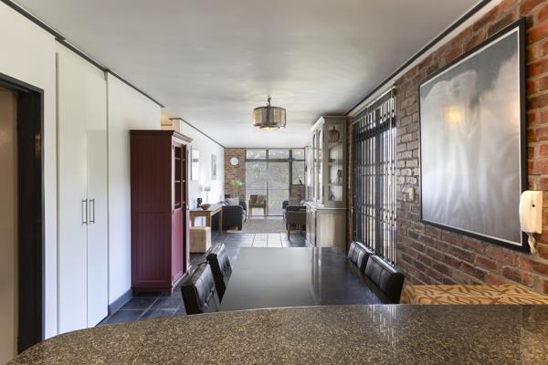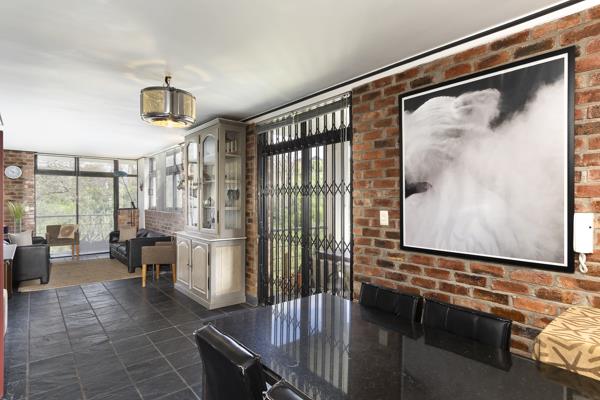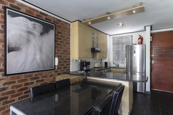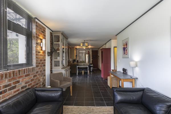 Open-plan kitchen and lounge leading onto balcony with built-in braai
