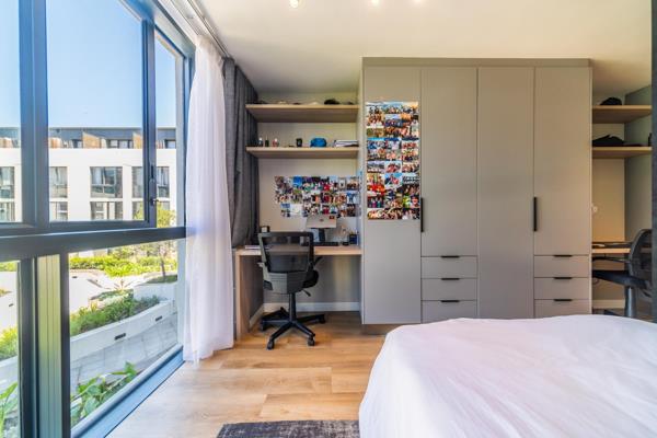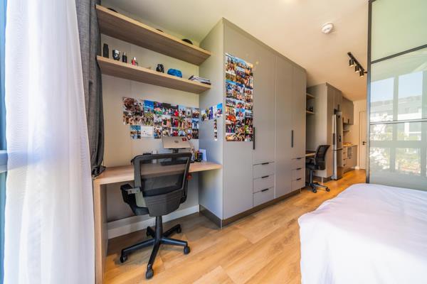 Inside, the property maximises its space with a thoughtful layout and modern finishes.The open plan two bedrooms is designed for comfort and productivity, featuring large windows that invite abundant natural light. Integrated storage solutions, including sleek wardrobes and built-in shelving, ensure a clutter-free living experience. Dedicated desk areas are thoughtfully incorporated into the design, providing ideal spaces for study or work, complemented by the comfort of ceiling fans for climate control. The wood-look flooring throughout the living areas adds a touch of warmth and contemporary elegance.