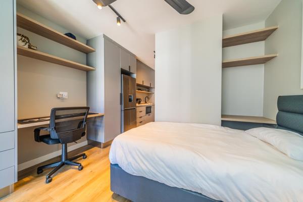 The compact yet highly functional kitchenette is a highlight, equipped with essential amenities for daily living. It features stylish cabinetry, a modern sink, a large refrigerator, and a built-in oven, catering to basic cooking needs. While counter space is efficiently utilised, the design ensures everything is within easy reach. The single bathroom maintains the property''s modern aesthetic, offering a clean and practical space.