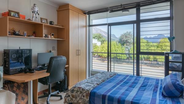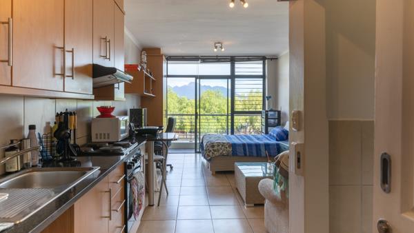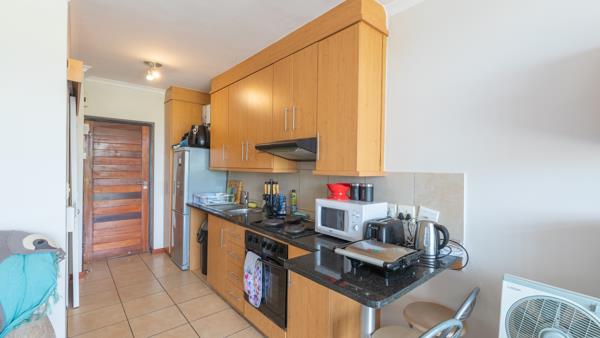 Kitchen with built-in cupboards, stove, oven and extractor fan.