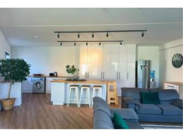 A sleek, open-plan living area flows seamlessly from the modern kitchen, complete with a gas hob for efficient cooking.