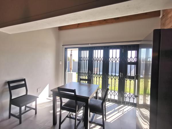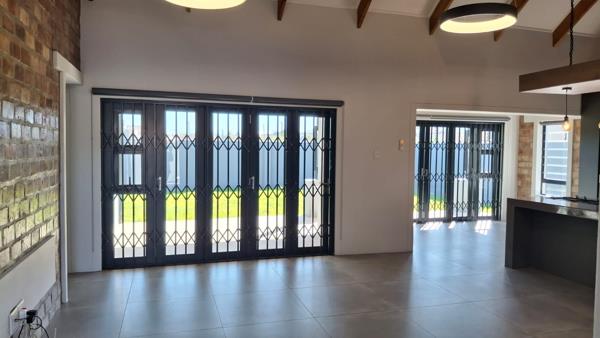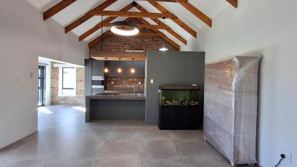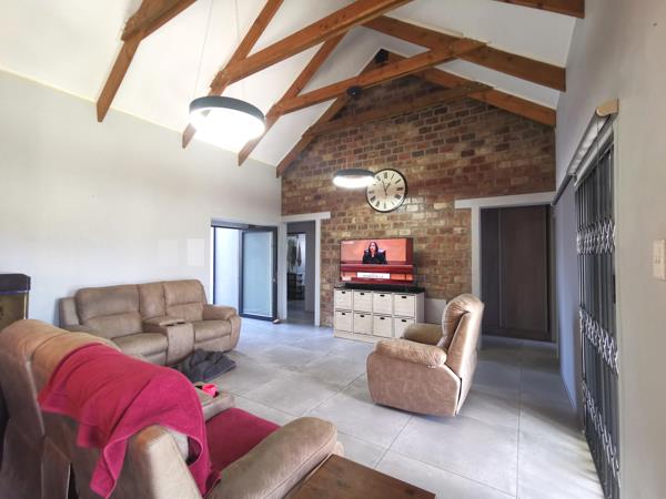 When entering this home, you are welcomed by a spacious open-plan lounge, dining area, and a breathtaking kitchen with a separate scullery. The living spaces seamlessly open up to the rear garden and built-in braai area through two aluminum stacking doors, creating a perfect blend of indoor and outdoor living.