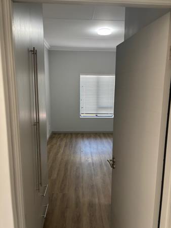 The residence encompasses three bedrooms, each a tranquil sanctuary. The main bedroom is air-conditioned . The bedrooms feature elegant wood-look vinyl flooring, all complemented by neutral grey walls and ample natural light. The property offers two impeccably appointed bathrooms, including a luxurious en-suite, designed with contemporary finishes. As part of a prestigious security estate, residents benefit from 24-hour security and a dedicated security gate, ensuring peace of mind. Further enhancing modern convenience are fibre connectivity and an efficient gas geyser.