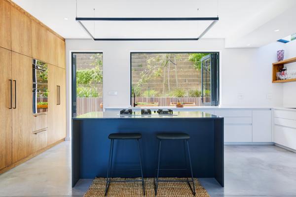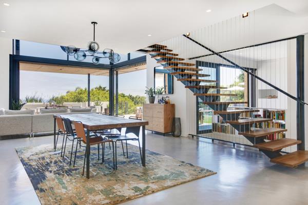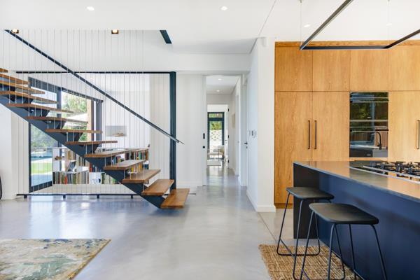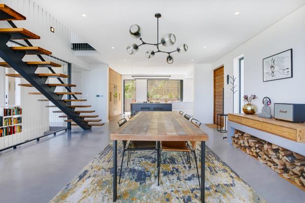 The first level has an open plan kitchen, lounge and dining room, with a guest toilet and 2 bedrooms, both en suite, as well as an office. The lounge leads on to a spacious and trendy entertainment area with stunning g black pool, built in braai, outdoor should and immaculately manicured indigenous garden.