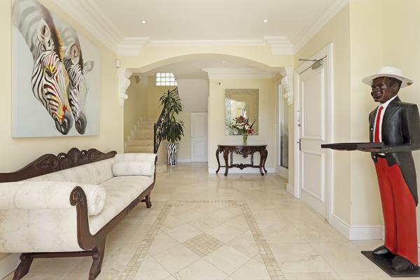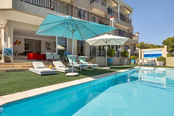 The expansive open-plan living area seamlessly blends indoor and outdoor spaces, creating an ideal atmosphere for relaxation or hosting guests. The villa features a large entertainment area, complete with a heated pool, tiered waterfall, and surrounding lush landscaping perfect for enjoying sunny days or evening gatherings.