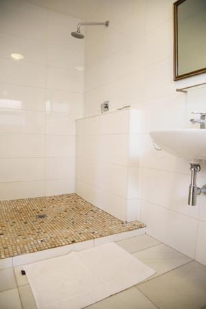 There is a luxuriously fitted King sized bed which is dressed in crisp white linen. The bathroom has a large shower.
