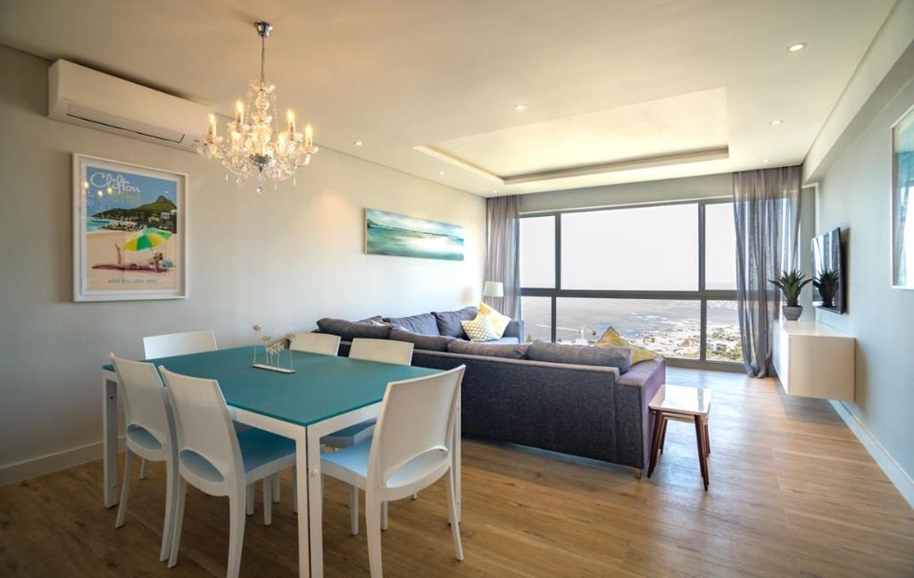 This fully furnished and equipped three-bedroom apartment is situated high up in Camps Bay with stunning views of the sea, Lions Head and the mountains.