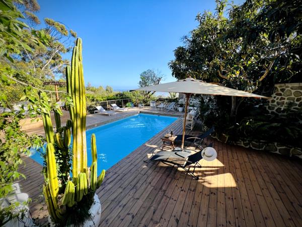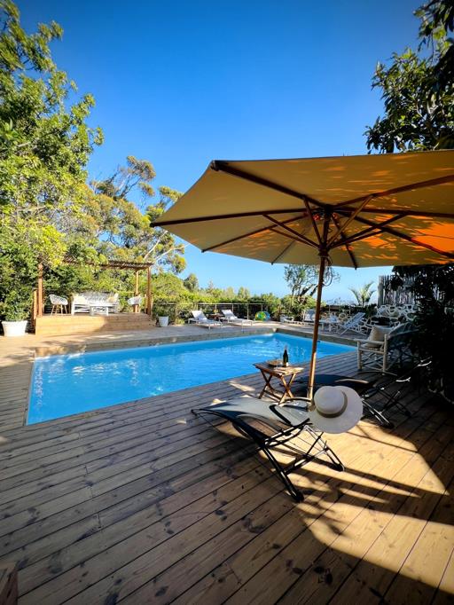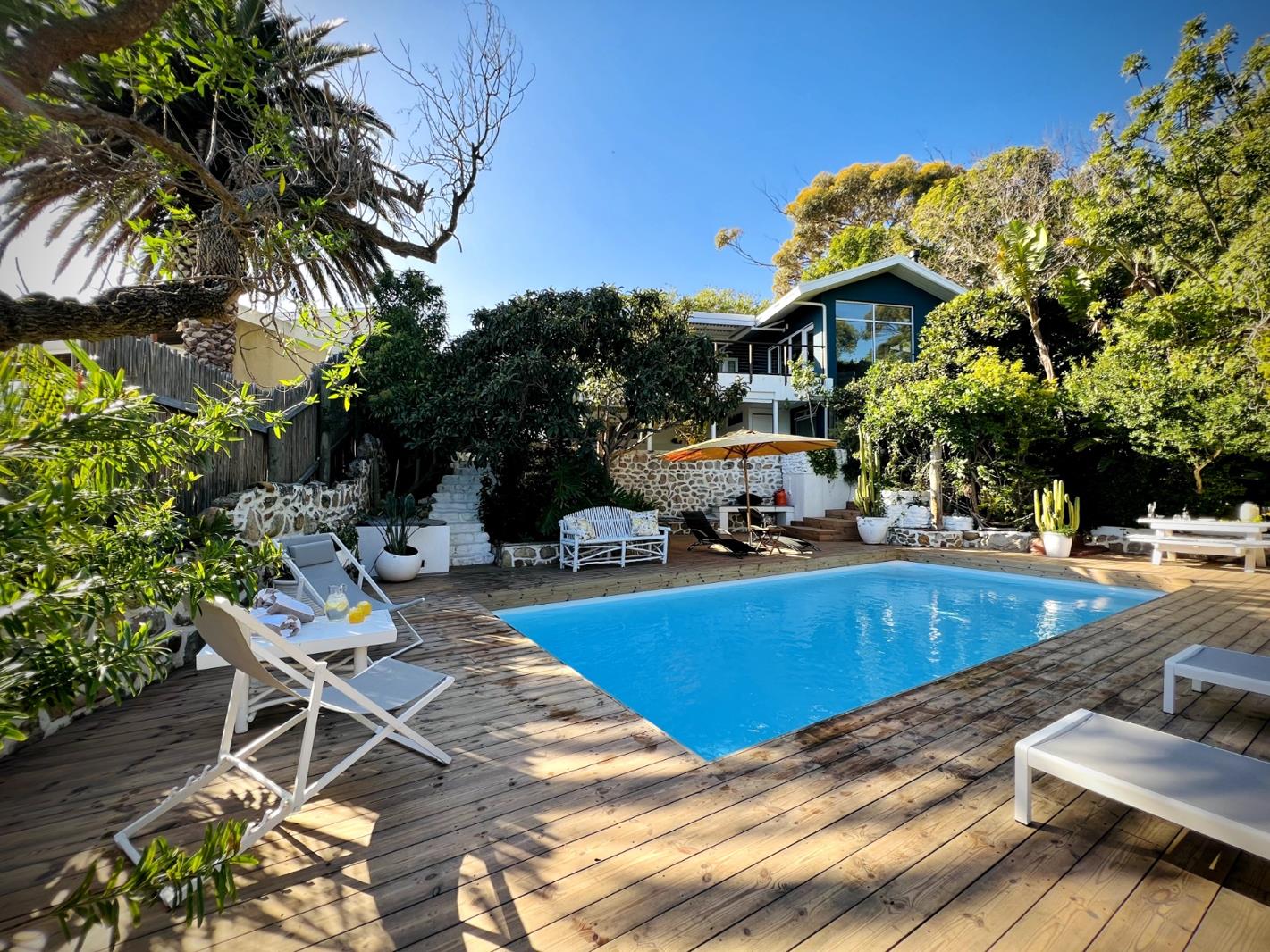 Wooden steps lead to the pool, surrounded by a wooden deck with chairs and shaded areas to relax. Lovely private areas in the garden to find some peace.