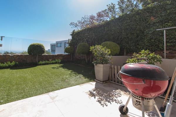 The open-plan lounge, kitchen equipped with a washing machine, tumble dryer, and dishwasher, and dining room flow seamlessly out onto a large patio with a Weber grill, extending further onto a beautifully landscaped garden.