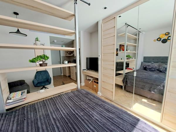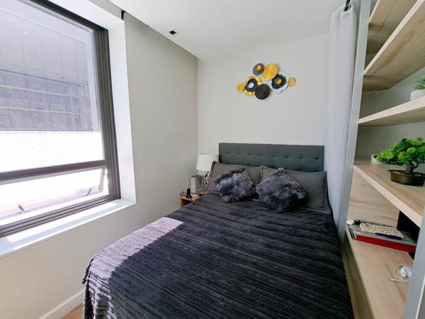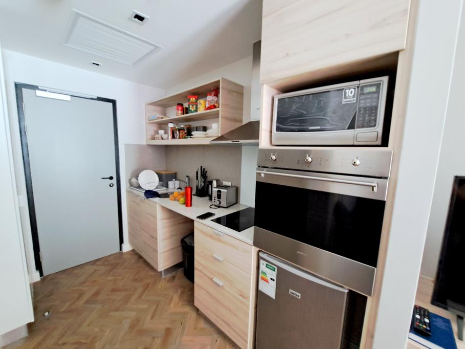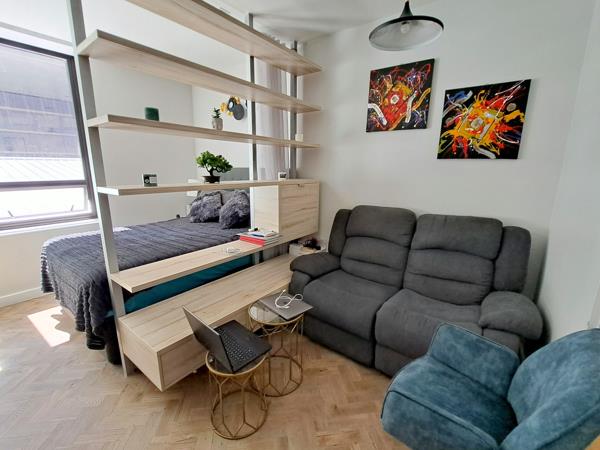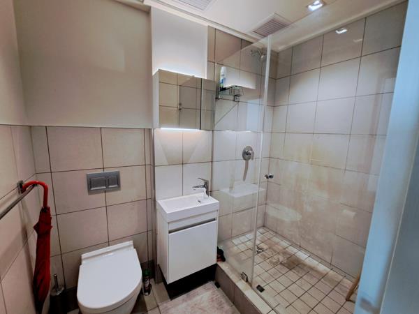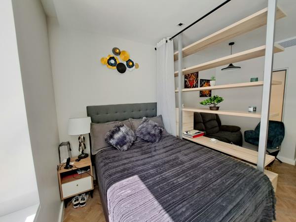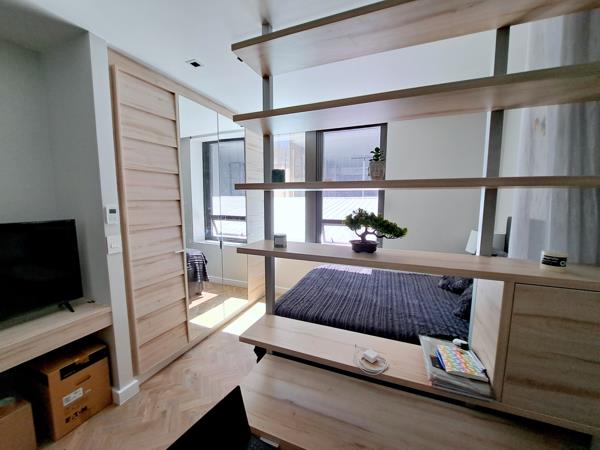 Modern and furnished bachelor apartment available from 15 March for a long term. The kitchen comes with a built in ovenhob, extractor , washing machine and microwave. Double size bed in the bedroom area.