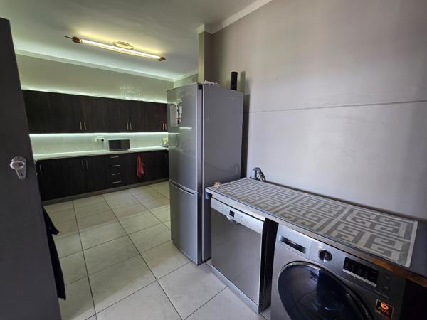 The large kitchen comes fitted with an oven, hob, extractor fan as well as ample built-in cupboards. It provides convenient plumbing and space for a