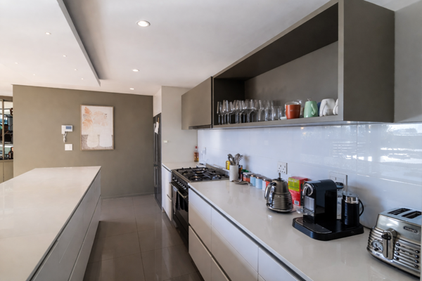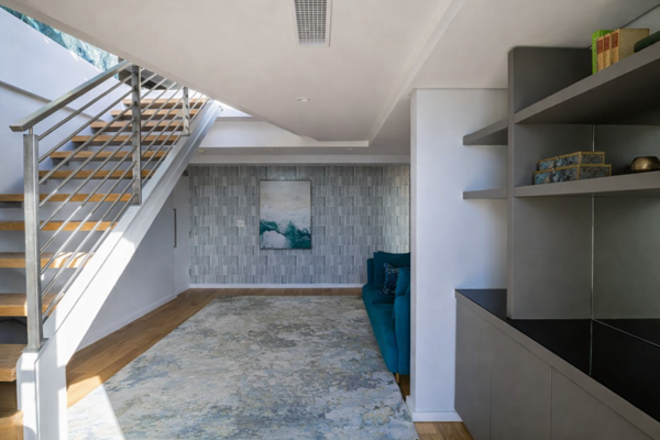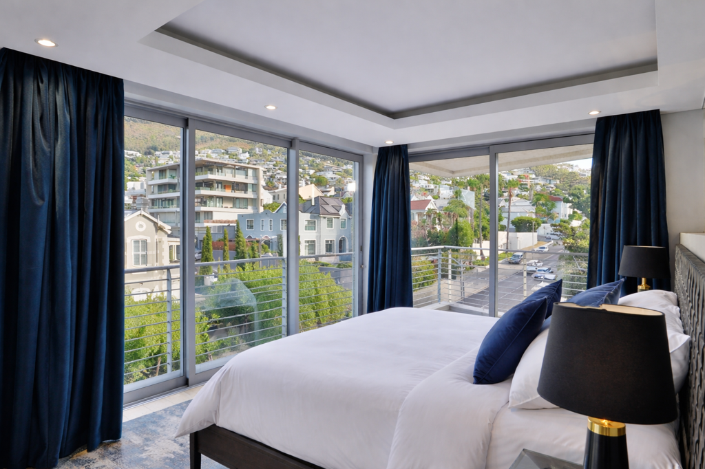 The upper level features an open-plan kitchen, dining, and living area that flows onto a large entertainment deck. Floor-to-ceiling windows bring in plenty of natural light and showcase views of Fresnaye and Lions Head, making this the perfect space to relax or entertain.