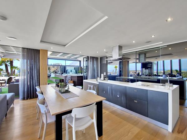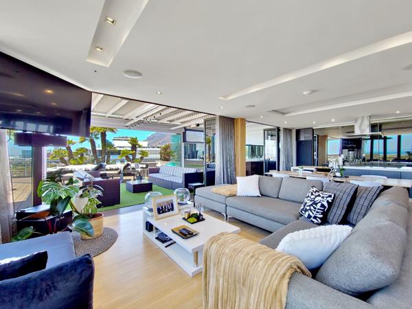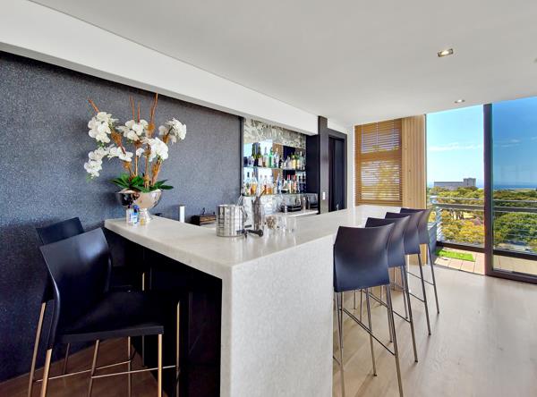 The living area flows out on to the large balcony. Here you will find the Jacuzzi that has been tucked into a corner and covered so it can be enjoyed in any weather. Take a walk around the balcony and take in the views of Table Mountain, the Waterfront and Green Point itself.