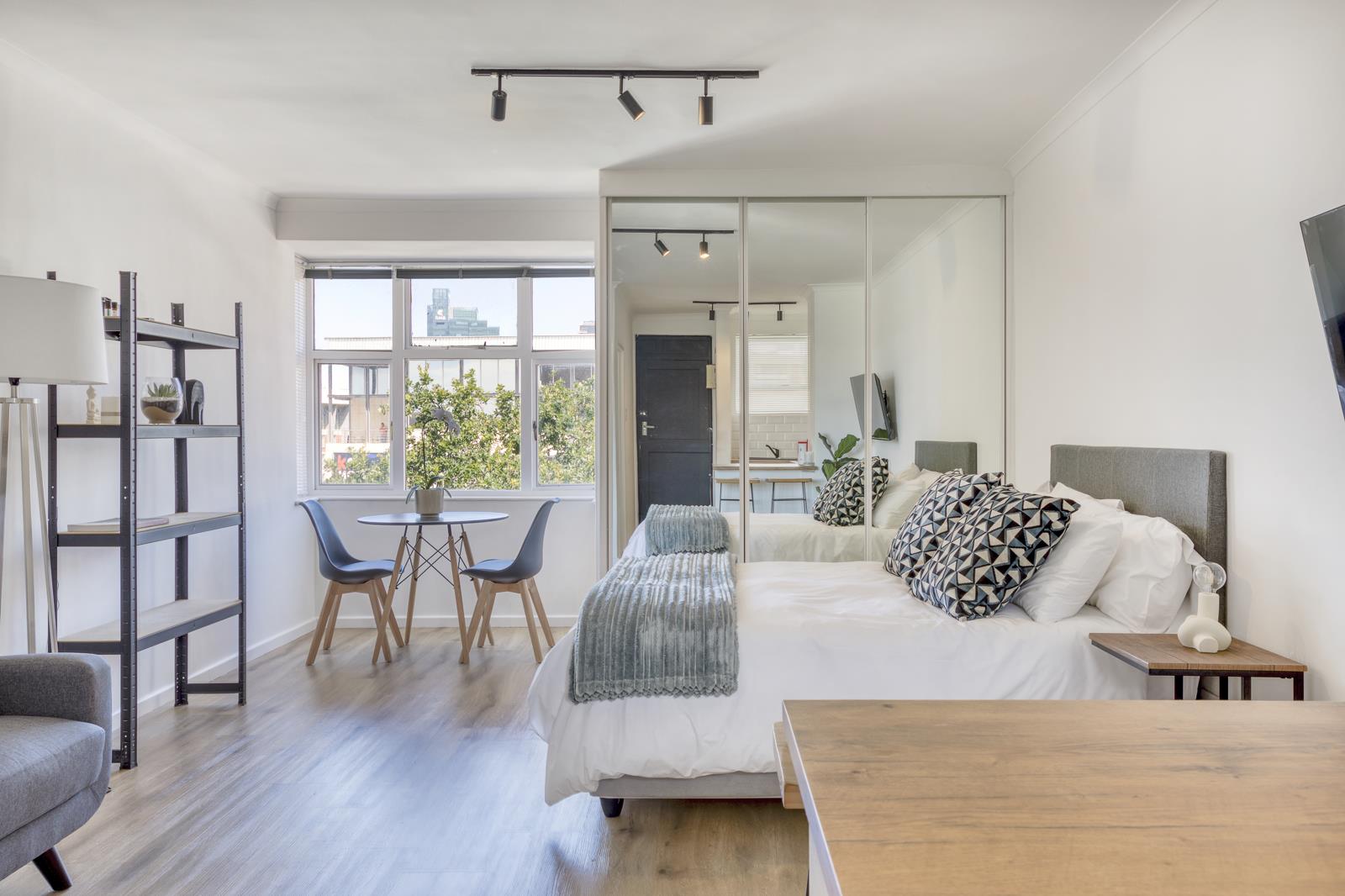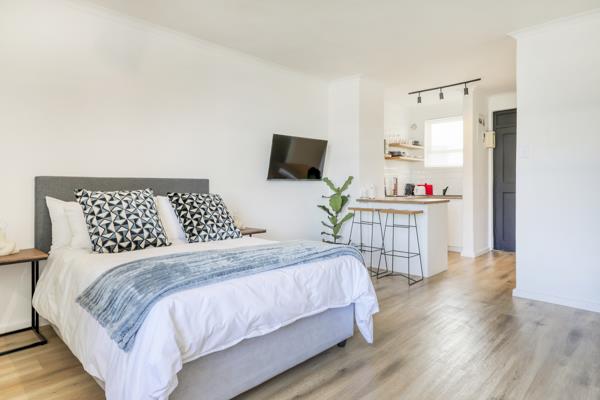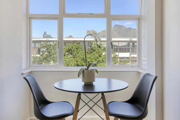 This bright and stylish studio offers a thoughtfully designed living space with modern furnishings, ample natural light, and a comfortable layout ideal for a working professional. The apartment features a well-equipped kitchen, a cozy sleeping area, a contemporary bathroom, and beautiful views of Table Mountain, creating a serene backdrop for daily living.