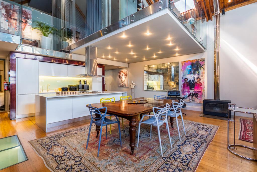 At the heart of the home lies a striking open-plan kitchen, complete with a discreet scullery tucked neatly behind. The kitchen flows seamlessly into the dining and living areas, where the sense of space is immediate and unforgettable. Triple-volume ceilings, framed by original wooden beams, create an atmosphere of light, airiness, and grandeur rarely found in residential homes.