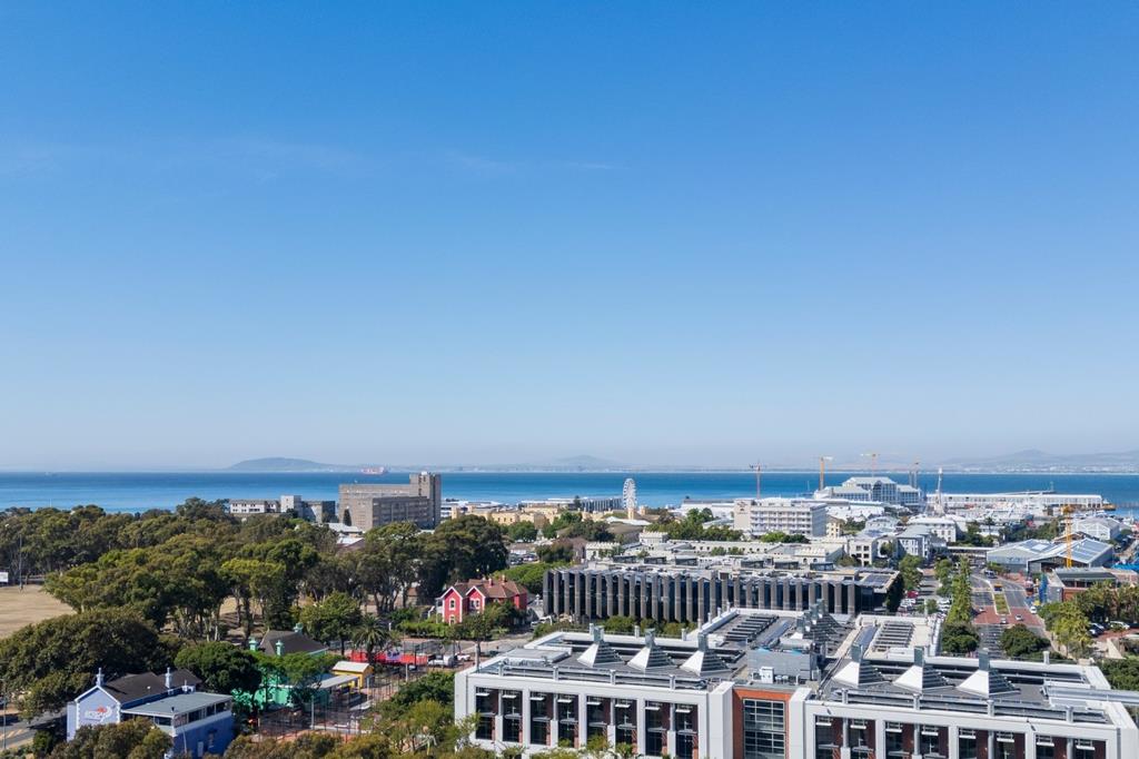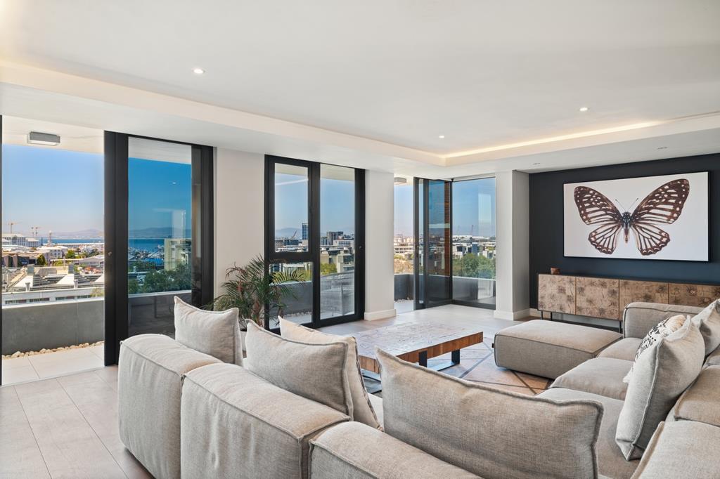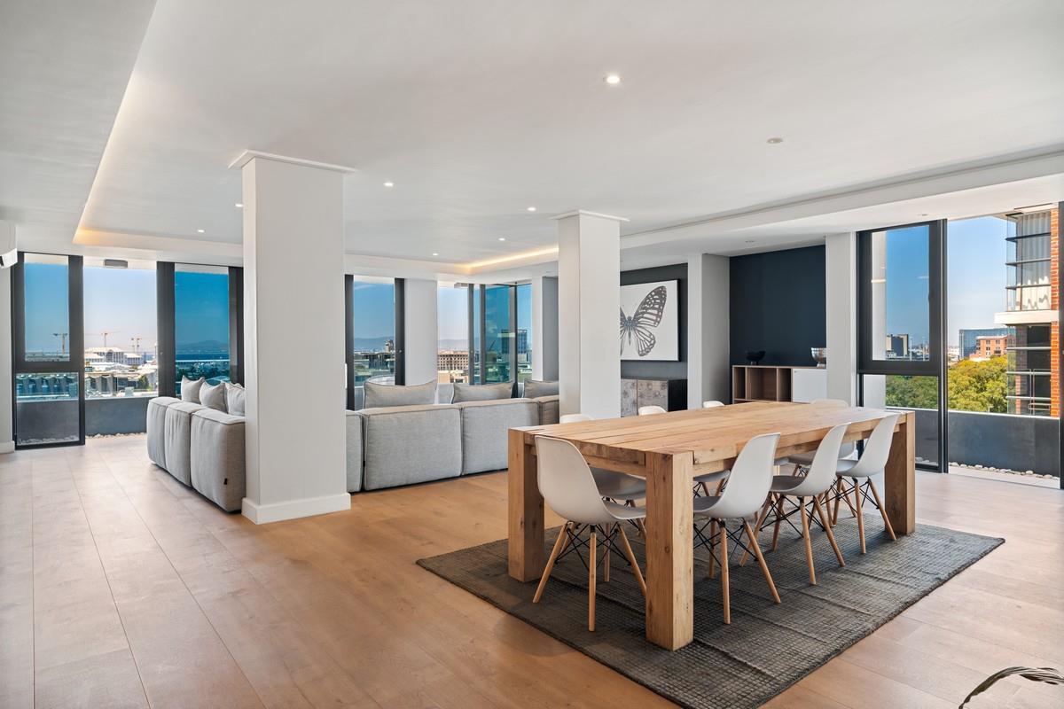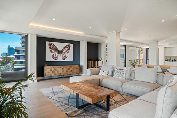 This exceptional, one-of-a-kind residence occupies the entire 6th floor, offering complete privacy, expansive proportions, and breathtaking panoramic views across the iconic DHL Stadium, Green Point Park, Robben Island, the harbour, and Cape Towns mountain ranges.
