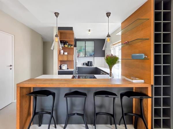 Step into the chic, open-plan kitchen, dining and living area, a haven for entertainers and those who appreciate natural light. Kitchen counter also serves as a bar counter with four barstools to remain. As a corner unit, the apartment is graced with windows all around, providing a breath taking backdrop for enjoying sunsets or soaking up sun on cooler winter days. Take advantage of the open balcony to relax and unwind with a sundowner after work, or to enjoy a coffee in the morning. The kitchen is thoughtfully designed with plumbing for two wet appliances and features a double sink for added convenience. Fridge, washing machine and dishwasher to remain.