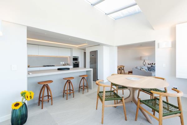 The heart of the penthouse is the modern open-plan kitchen, seamlessly connected to the living and dining areas. Designed with clean lines and contemporary finishes, the kitchen offers ample storage and workspace, perfect for both everyday living and hosting guests. Large windows flood the space with natural light, enhancing the airy, open feel and framing the spectacular views that surround the home.