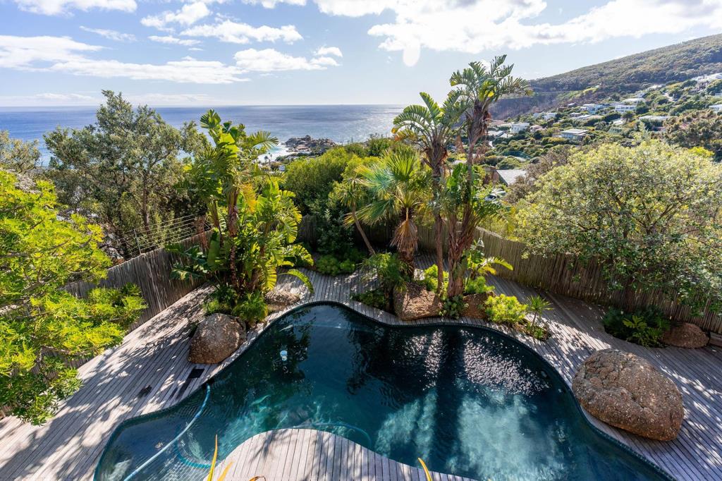 Two large bedrooms, each with sliding doors that lead to a wooden deck overlooking the pool below.