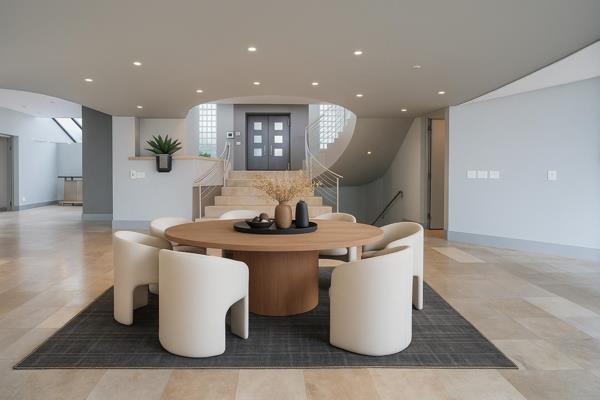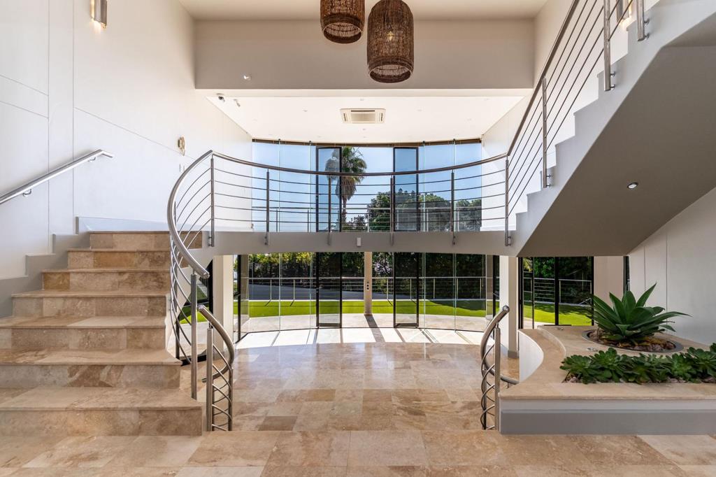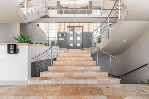 Triple-volume entrance hall with sweeping staircase and floor-to-ceiling windows
