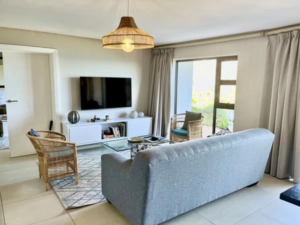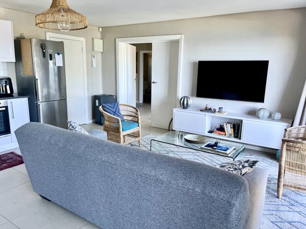 The apartment features a generous open-plan living and dining area, furnished with a comfortable sofa and a neat dining nook with bar seating.