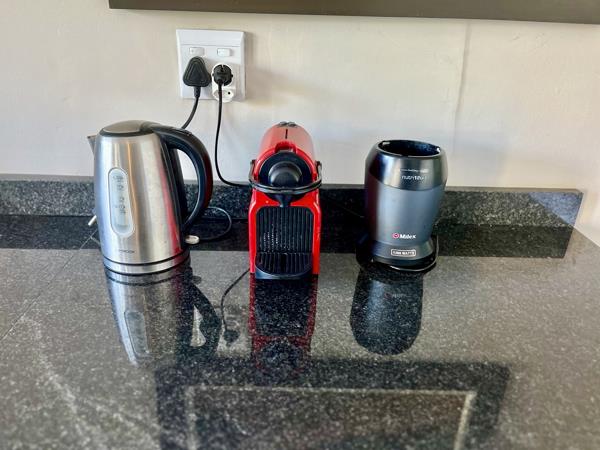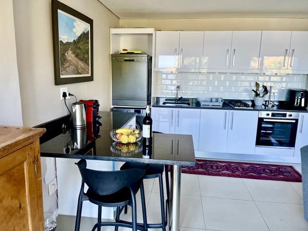 The modern kitchen is fully equipped, with ample cupboard space and everything needed for easy day-to-day living.