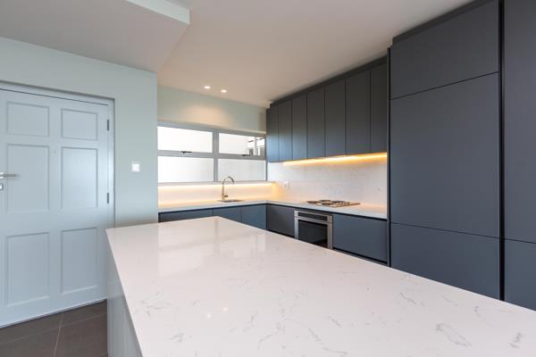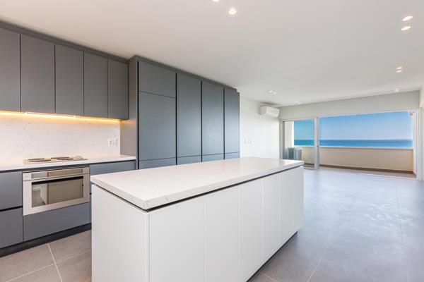 Spacious open plan living, dining and kitchen area flowing onto an open, north facing, balcony with Robben Island on the horizon.